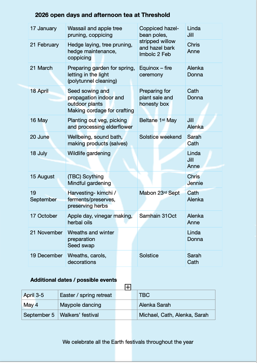 We are open every day to visitors, but this is our home, so we ask you to contact us at info@thresholdcentre.org.uk to arrange this with us. Your contact details will then be passed to one of us (your “go-to” person), to liaise with you and organise your visit to ensure it is a success. If you are thinking of joining our community, we recommend that you visit us on a few occasions for different events, to talk to as many of us as possible and get a feel for what it might be like to live here. Please do not bring dogs without discussing it with us first. It’s not that we don’t love them, but if we get more than one, it can cause problems.